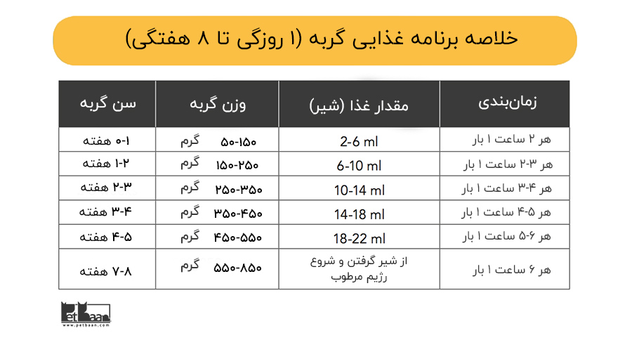 در جدول زیر میتوانید به صورت خلصه، رژیم غذایی مناسب بچه گربه را از تولد تا 8 هفتگی ببنید.